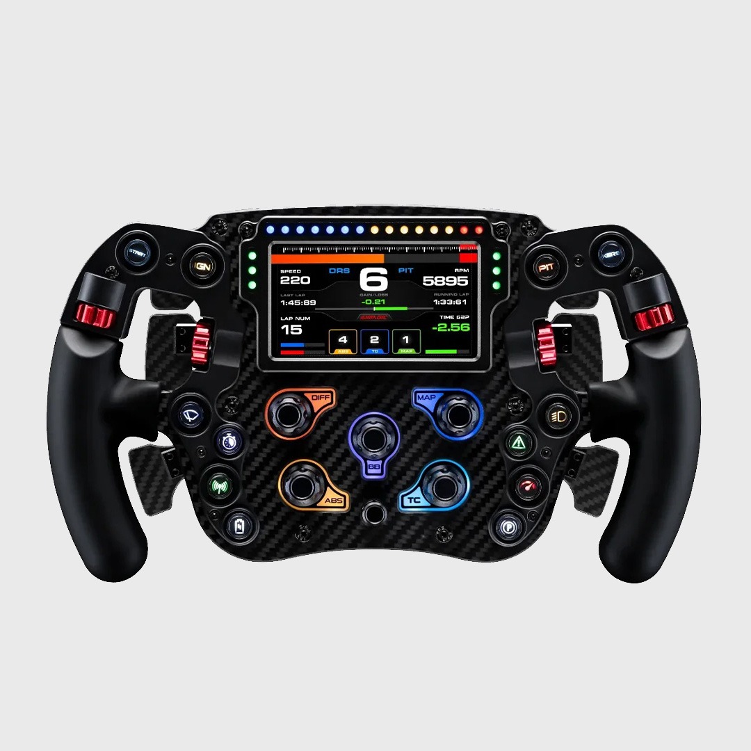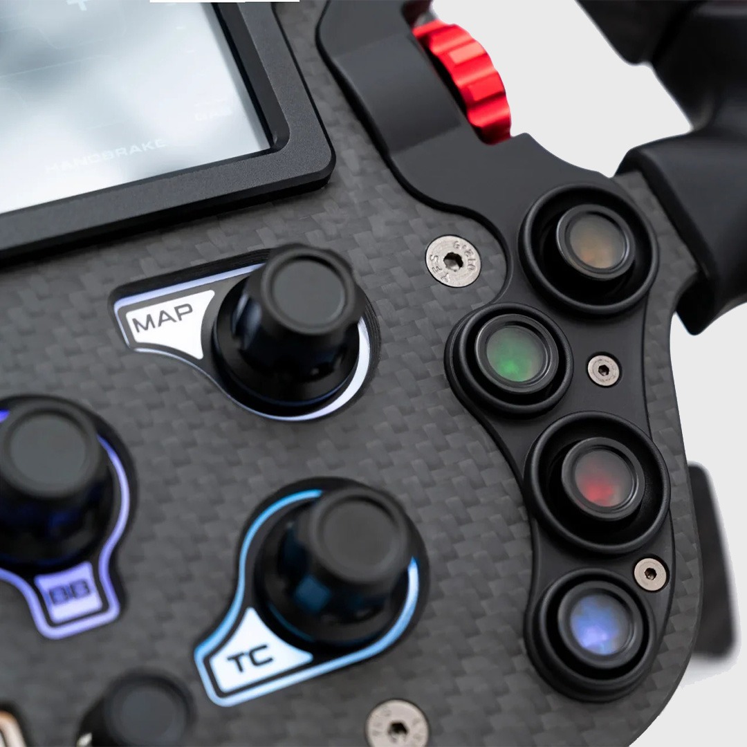 Diseñado en conjunto con pilotos profesionales e ingenieros de carreras. 290mm. Fibra de carbón de 5mm. Peso: 1,700g. Pantalla LCD de 4.3″. LED´s indicadores. 6 módulos de paletas – 2 paletas de cambio, 2 paletas programables y 2 paletas de clutch.